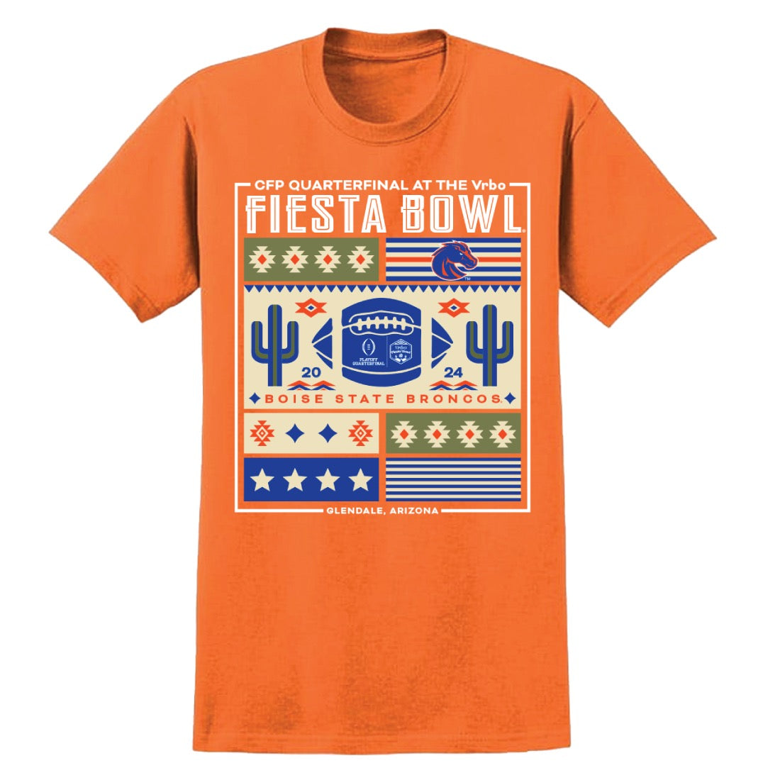 Gear up for game day with this exclusive Boise State Broncos Fiesta Bowl T-Shirt! Featuring a bold, Southwest-inspired design, this shirt celebrates the 2024 CFP Quarterfinal at the Vrbo Fiesta Bowl. The design captures the spirit of Bronco Nation with eye-catching geometric patterns, iconic cacti, and a football graphic that screams team pride.