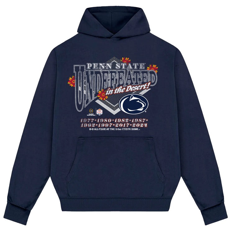Celebrate the Penn State Nittany Lions’ legendary achievements with this “Undefeated in the Desert” hoodie, honoring their incredible 8-0 record at the Vrbo Fiesta Bowl. This hoodie features bold, vibrant graphics showcasing the Nittany Lions logo, the years of their victories (1977, 1980, 1982, 1987, 1992, 1997, 2017, and 2024), and desert-inspired accents, making it the perfect tribute to Penn State’s dominance in Glendale, Arizona.
