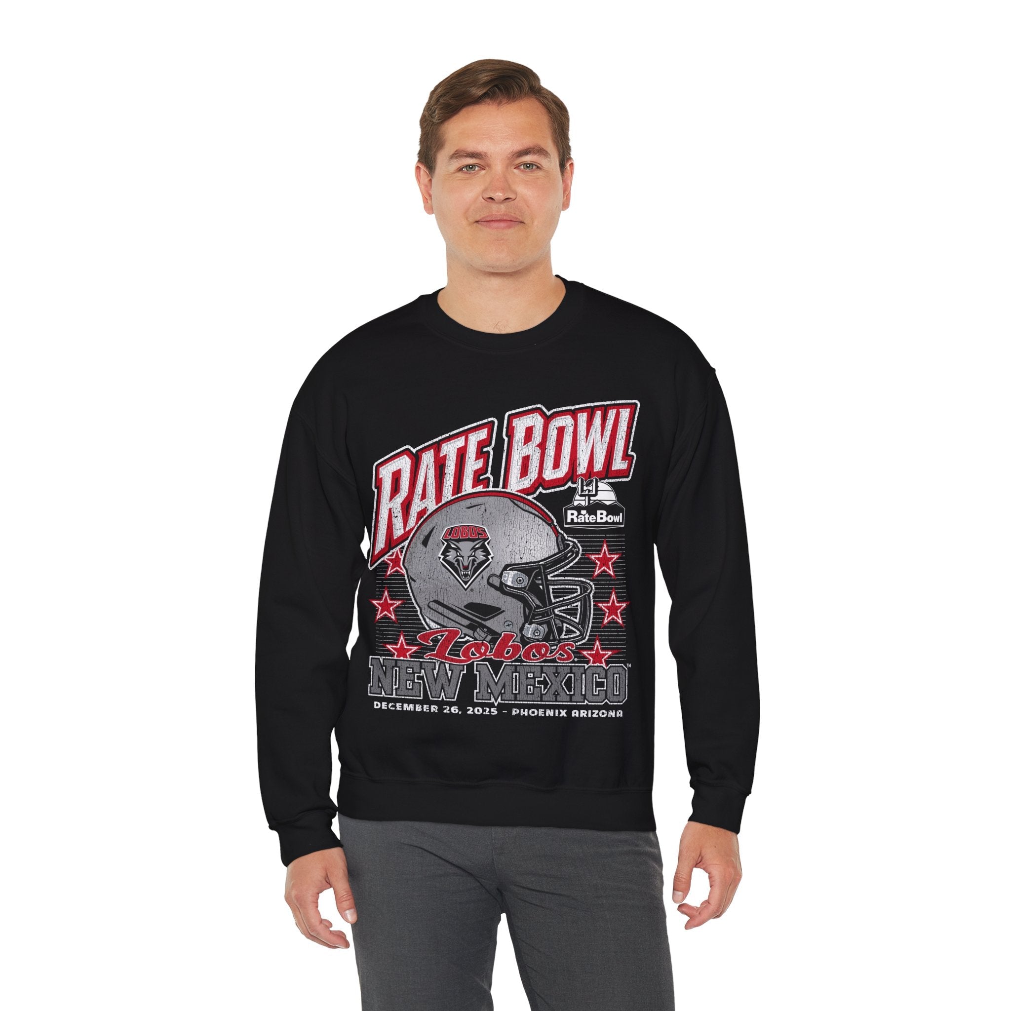 Bring full bowl-season energy with this vintage-style Rate Bowl 2025 University of New Mexico crewneck. The distressed helmet graphic, bold Cherry & Silver palette, and retro varsity layout give it that classic “worn-in sports poster” feel Lobos fans love. If you’ve ever repped UNM through late-night study sessions, freezing Albuquerque mornings, or loud watch parties with the whole squad, this one feels like home.