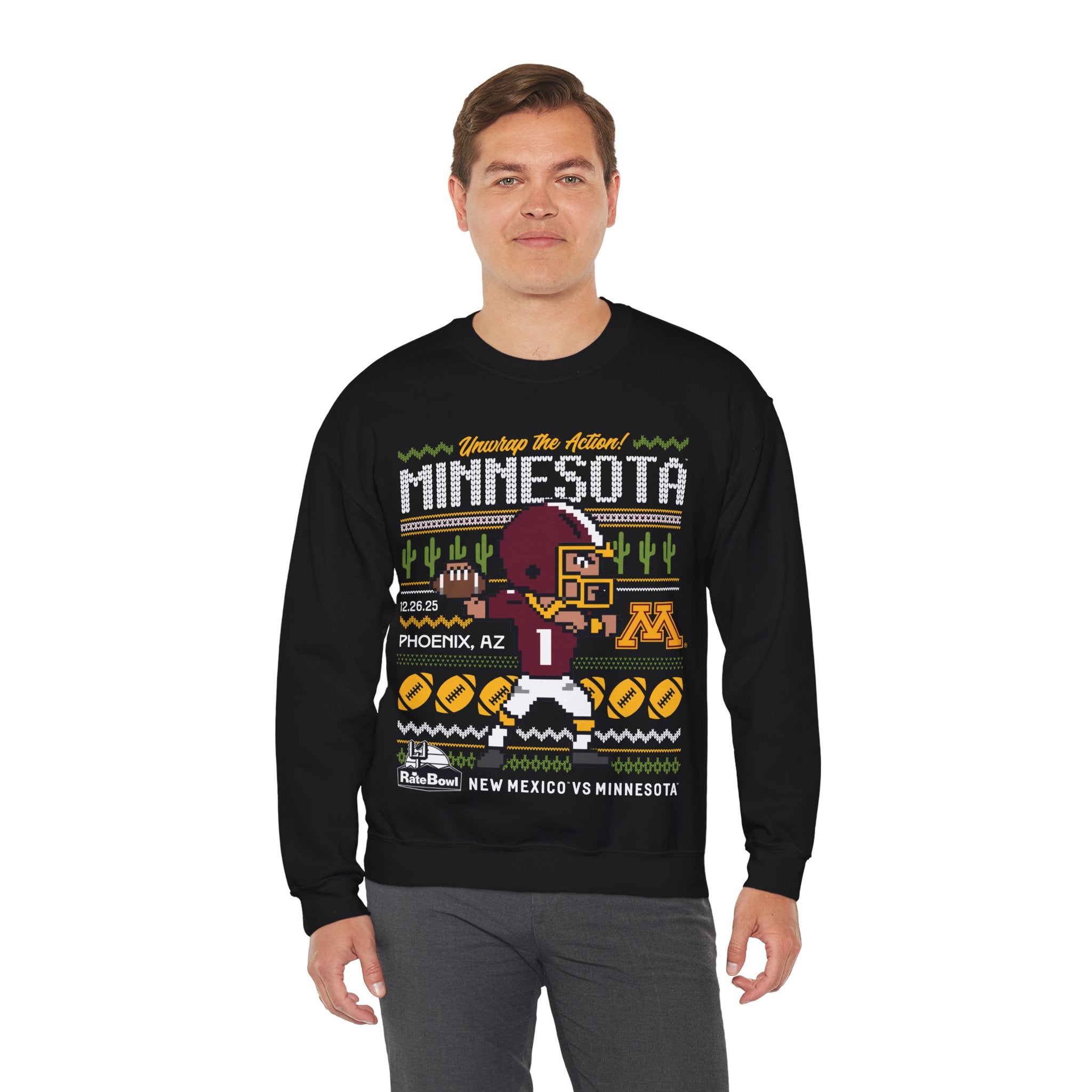 Lean all the way into bowl-season hype with this pixel-style Rate Bowl 2025 University of Minnesota crewneck. It’s got full “retro video game meets ugly sweater” energy — cactus rows, football icons, and a pixelated Golden Gopher QB ready to sling it in Phoenix. If you’ve ever survived a Minnesota winter, sprinted across campus to catch kickoff, or yelled Ski-U-Mah loud enough to scare your neighbors, this sweatshirt will feel like it was made for you.